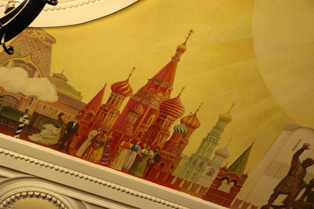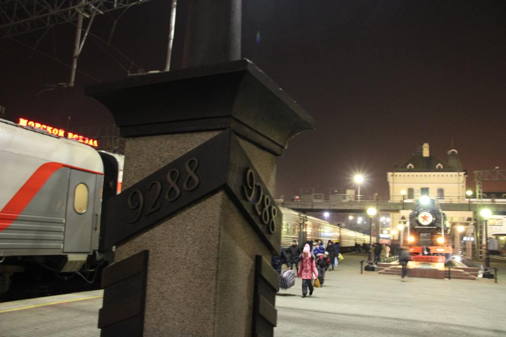 A stone kilometer post engraved with “9288 KM from Moscow” stands in the center of the platform.